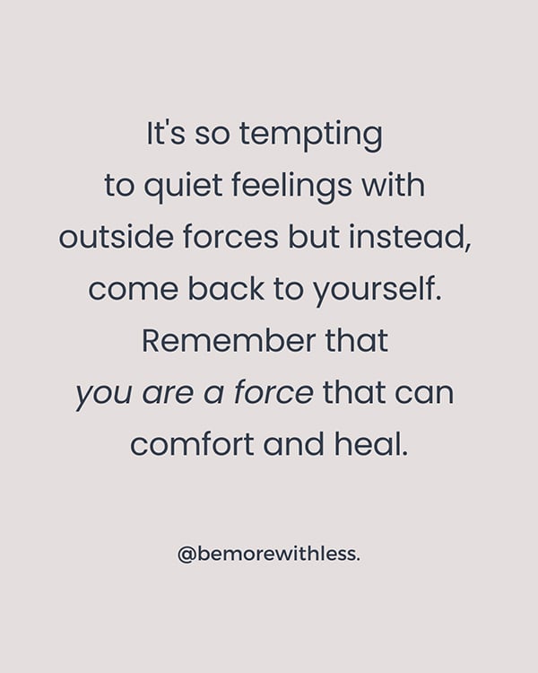 We can’t escape ourselves and the sooner we realize that we don’t have to fix our feelings, the sooner we can notice that for the most part, they come and go. Some need our attention. Some don’t. And the ones that do need our attention don’t need us to numb them or shove them down, they simply ask us to take care. When it is time to take action, consider something soothing, comforting and healthy to try. Here’s a list of self-care ideas to consider from this article.