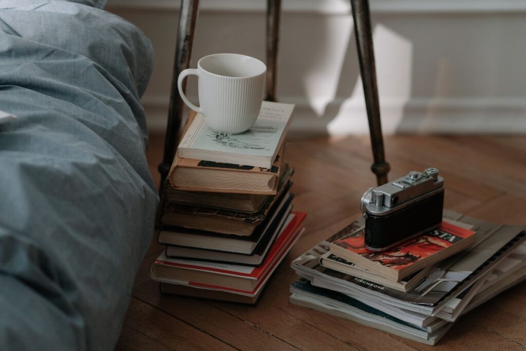 The idea is simple: each night before bed, choose one pile to clear. That’s it. One area, one stack, one overflowing laundry basket – whatever needs your attention.
